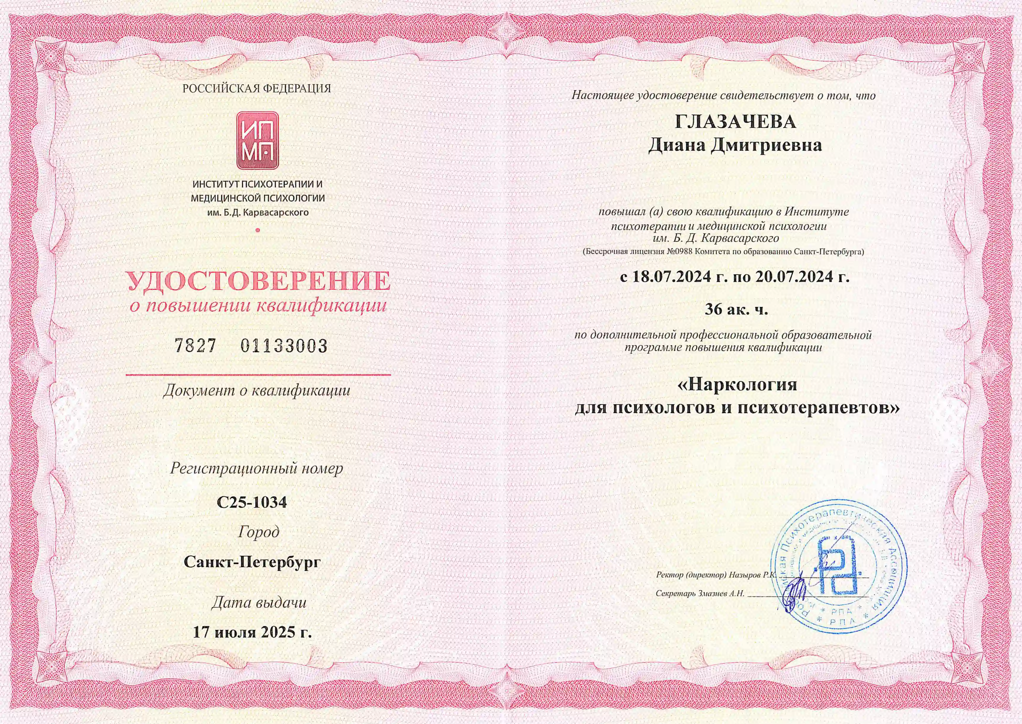 • 2024-2025 — Цикл повышения квалификации по направлению «Наркология для психологов и психотерапевтов». Институт им. Б.Д. Карвасарского, Санкт-Петербург.